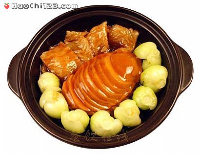 2、锅内放化鸡油(50克)烧至四成热,放入豆瓣酱炒断生,加入鲜汤(750克)烧沸,捞出豆瓣渣不用,放入鸡块和五花肉(均要焯水)、火腿片、炒好的肉粒、精盐(3克)、料酒、老抽、蚝油烧沸,打去浮沫,放入整姜、葱,用小火烧至六成热时,再将素鲍鱼用纱布包好,放入同烧,入味上色。