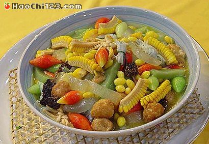 贴士:用料内容要多样,岔色分明,大小要切均匀,焯水和烹制要保持原料本色。调味烹制注意清淡、爽口、味鲜,油量宜少,勾芡宜薄。