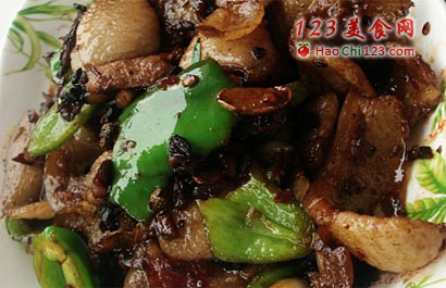 3、郫县豆瓣和豆豉切碎,准备葱姜蒜。小火下油慢慢炒豆瓣和豆豉、花椒到干香出红油的时候下葱姜蒜慢炒,出香味后倒入肉,炒成卷曲成灯盏窝时倒料酒和酱油上色,最后加入青椒炒两分钟出锅。