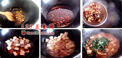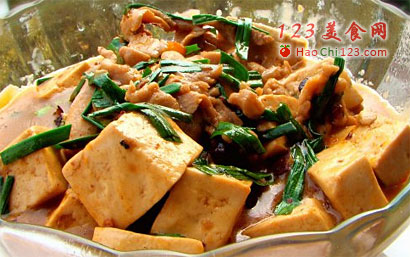 5、今天做的家常豆腐,也可以叫做肉片豆腐,也可以叫烧豆腐。在四川,一般家庭做豆腐都免不了两种,一种就是这样成四方块来烧着吃,一种就是煎到两面金黄后再来煮。前一种有最出名的麻婆豆腐,后一种有很受人欢迎的怀胎豆腐。
