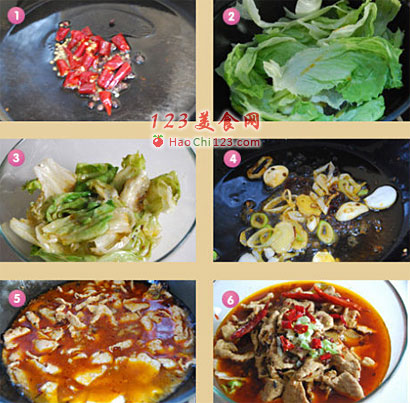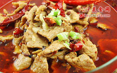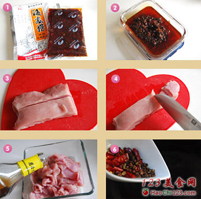 12、开锅片刻后既可以盛出,余下的干辣椒剪成小段放在肉片上,然后放入葱姜蒜末,还有余下的花椒。