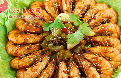 9、生菜垫盘底,码上虾,青笋丁放在中间,点缀香菜,撒上少许白芝麻即可。
