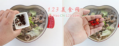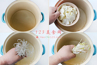 4、选一个适合的容器,一次放入豆芽,卷心菜与煮软的粉丝,最后铺上肉片后,淋上高汤。加入少许香葱花椒与红辣椒,浇热油即可食用。