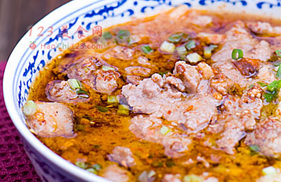 5、锅内油热后下入两勺郫县豆瓣,炒出红油,加葱姜蒜碎,炒出香味后,加汤或者加水后,放入一块汤调料,大火稍煮,加生抽、料酒盐、将肉片倒入锅中,用筷子轻轻拨散,变色后就倒在步骤3的菜底上,撒花椒粉1勺、辣椒粉1勺、蒜泥1勺。