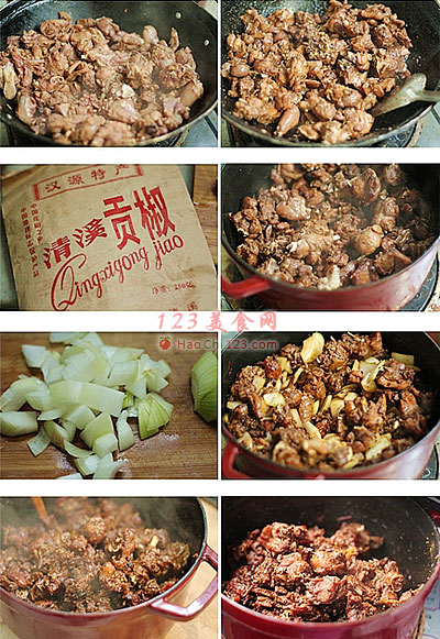 6、两个重点,掌握好了,做出来的兔子就很美味。第一,兔子本身有草腥味,一定要煸干水汽。第二,加些花椒可以去除腥味。