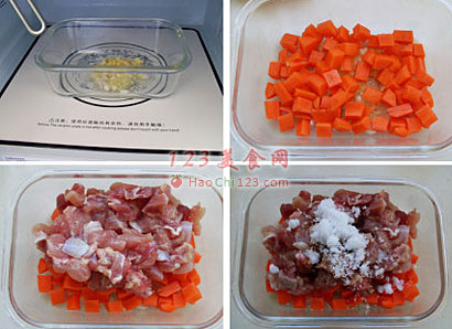 6、取出容器,放入胡萝卜丁和鸡丁。