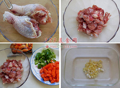 鸡腿2个、胡萝卜、尖椒、黄飞鸿麻辣花生。2、胡萝卜洗净,切成丁。尖椒洗净,去蒂和籽,切成小块。