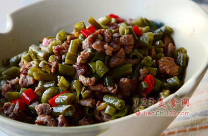 二、牛肉末酸豇豆: