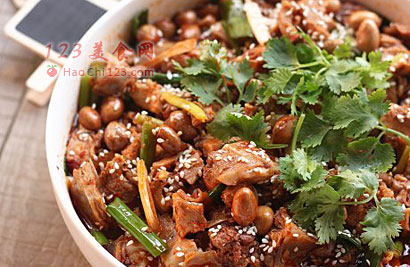 6、加入兔丁和大葱段,拌均匀,再加入适量的油酥花生米,撒上白芝麻和香菜段即可。