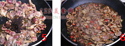 4、趁热放入腌渍入味的鸡胗片煸炒。