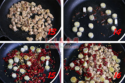 19、加一点点鸡汤、放入提前做好的碗芡和匀倒入迅速翻炒均匀,加入花生米。