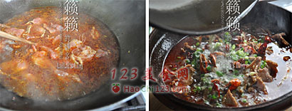 3、锅内倒入高汤(或清水)1碗,大火煮开后,调入盐、白糖、头抽调味。将腌制好的牛肉一片一片地放入锅中,牛肉煮至变色时,锅内淋上1小勺水淀粉搅匀煮沸,连汤带肉一起倒入有白菜粉丝垫底的大碗中。