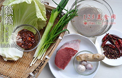 2、红薯粉丝冲洗一下用清水浸泡变软备用;大白菜浸泡洗净后手撕成片状;大葱洗净斜切成圈状;小葱切末、独蒜去皮拍碎剁细、生姜切末、干红椒去蒂去籽斜切成圈状备用;豆瓣辣酱斩细备用。