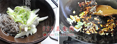 4、在大碗面上铺剩余1╱2的姜末及蒜末,以及全部的小葱末,撒上适量的花椒粉(怕辣的也可略)。锅烧热倒入2勺油,下花椒粒及干红椒圈,中小火煸香后捞出,撒在葱末上。锅继续加热烧到八成热度时将热油淋入大碗中即可,上桌趁热食用。