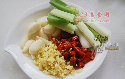 4、先大葱切段、大蒜剥去外皮,不切,要整个的。再将泡椒和生姜细细剁成碎,川菜讲究将配料剁碎,剁的越碎越出味儿。
