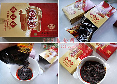3、这里着重介绍的是表弟和表弟媳妇春节来的时候,从成都专门给稍回来的特级“鹃城牌香辣酱”。老饕们都知道要想做出地道的“川味”,郫县豆瓣是出味的关键,而“鹃城牌”是郫县豆瓣的正宗鼻祖。一大盒香辣酱,里面是四小盒,小盒子里是袋装的香辣酱,正好够做一餐的。