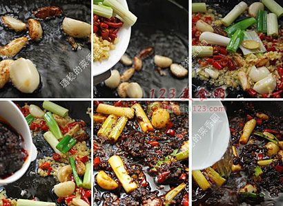 5、起锅倒油,先将大蒜瓣炸的表面焦黄,然后下大葱段、泡椒末和生姜末略,紧接着下香辣酱,改小火慢慢炒,直到炒出香味。