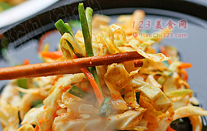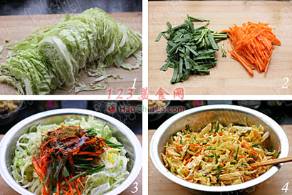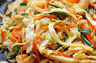 包菜1个、韭菜1小把、胡萝卜半个、盐2勺半、鸡精1小勺、胡椒粉1/2小勺、红辣椒粉30克、孜然粉20克、香油20克、色拉油适量。2、韭菜、胡萝卜洗净切成长段和细丝。