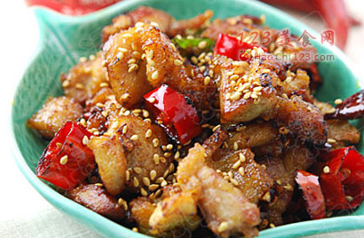 贴士:辣子鸡,是一道大众喜闻乐见的美味佳肴。每个地方有他们自己的配料喜好,但有一点就是觉不能少了辣。做这道菜的时候建议选用鸡腿肉,口感更嫩。鸡腿剔骨切成小块腌制入味,过油炸至定型取出佐辣爆炒。