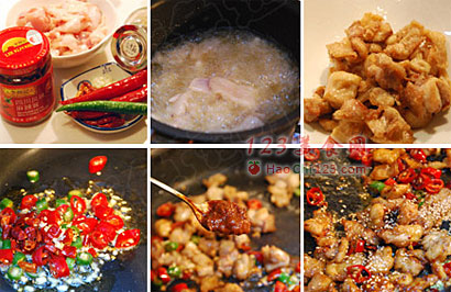 5、放入穿过油的鸡丁翻炒,加入白糖,淋上生抽,烹入料酒炒匀。放入四川辣酱快炒。