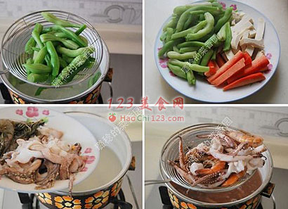 2、烧沸水锅,将豆角汆至熟,捞出沥干备用。胡萝卜和豆腐均切成食指粗细的小段。将清洗干净的鱿鱼头和鲜虾一并放入沸水内焯(氽)约4分钟至熟。