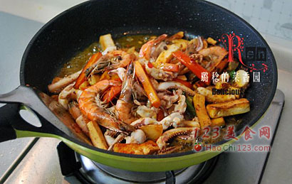 6、加了好多的蔬菜,营养和维生素也齐了,非常下饭,省去了先将鲜虾油炸的步骤,过沸水汆熟,即省油又可以去腥,非常适合家庭制作。