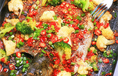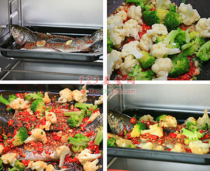 7、带手套将鱼从烤盘取出,将炒好的原料倒在鱼身上及盘中,再放入烤箱中烤两分钟(使各种原材料及汤汁的味道与烤鱼融为一体)。