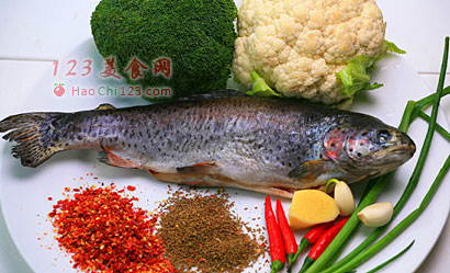 草鱼(二斤左右)、菜花、香葱、西兰花、葱、姜、蒜、小红椒、五香粉、孜然。