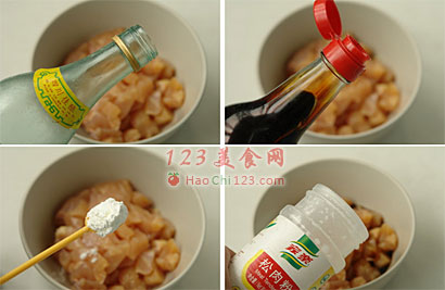 2、在切好的鸡丁中加入酱油1茶勺、淀粉1小勺、米酒一小勺、和少许松肉粉腌制20分钟。
