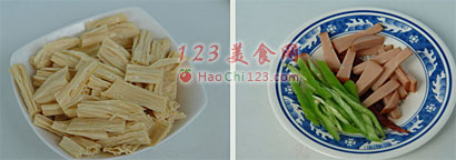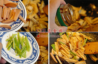 2、锅中放入2勺油烧热,放入3-4个干红辣椒与1小勺川味酱炒香倒入切好的腐竹(一定要沥干腐竹的水分),大火翻炒2分钟左右加入火腿淋少许水,继续翻炒1分钟,最后加入青辣椒略炒即可关火出锅。