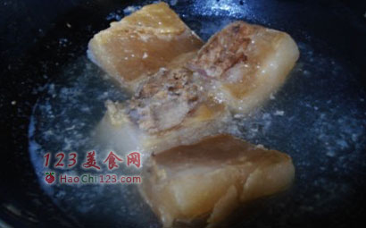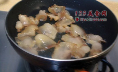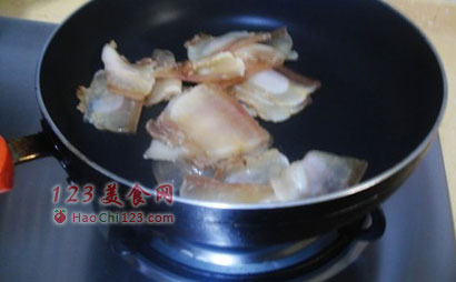 5、腊肉入锅小火煎,不要大火,火大了油一下煎出来,肉片儿就焦了。