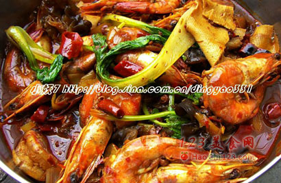 虾、木耳、干豆腐、青菜、香菜、花椒、干辣椒、糖、葱姜蒜、麻辣火锅调料。2、起锅倒油,油热后放入葱姜蒜爆香,然后放入花椒和辣椒炒出香味,加入火锅调料,量根据虾得多少自己掌握。炒出红油,将木耳和干豆腐下锅翻炒大约翻炒2分钟,再放入虾,都裹上酱料后,加入一勺糖,主要目的是提鲜。