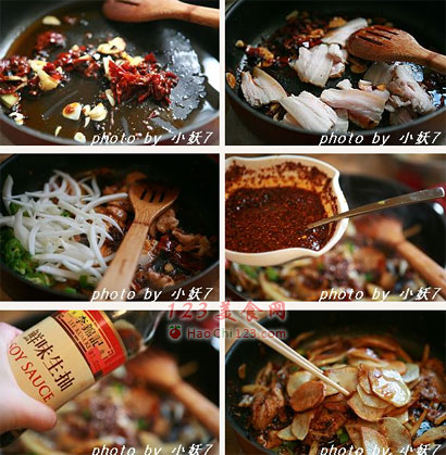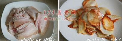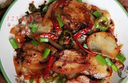 五花肉二两、土豆中等大小一个、洋葱20克左右、尖椒一个、葱、姜、蒜。2、将土豆去皮,切成比平时炒土豆片时切得厚一倍的土豆片。然后放到锅中炸至金黄,也可以在锅中放入少量油将土豆片煎至两面金黄。我的这个就是煎的,但是煎的土豆片有些软,没有炸的硬。
