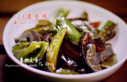 贴士:没有炭火的,可把锅烧热后放入青椒,干烧至青椒变色后加入少许盐,烧至皮起皱。捞出切块。