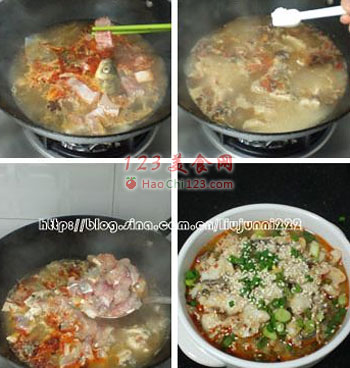 4、下入鱼头及鱼骨部分,煮约5分钟。