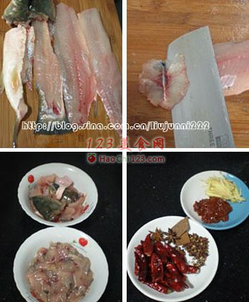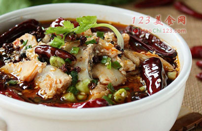 6、将锅洗净后再次倒入适量的油,下入干辣椒及剩下的花椒,小火将其炸出香味后连油一起倒在鱼片上即可上桌。
