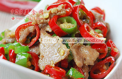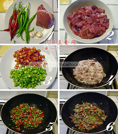 黄牛肉(最好选牛里脊,黄瓜条也行)300克、青尖椒150克、红尖椒150克、蒜2瓣(约10克)。2、挑去牛肉的筋膜,将黄牛肉切成小薄片,切得尽量薄些,如果觉得不好切,可以将牛肉放入冷冻室冻至刚硬,这样便于切片。然后用1茶匙淀粉、1汤匙(15ml)酱油、1茶匙小苏打和1汤匙油拌匀腌制15分钟。