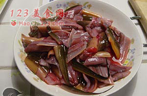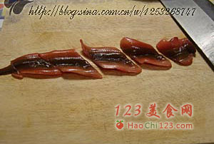 1、鳝鱼去头去内脏(肉档工作人员完成)洗净,(清洗时在水中加入盐可去除鳝鱼的粘液——雪鸿先生补充)沥干水分,切段。