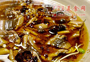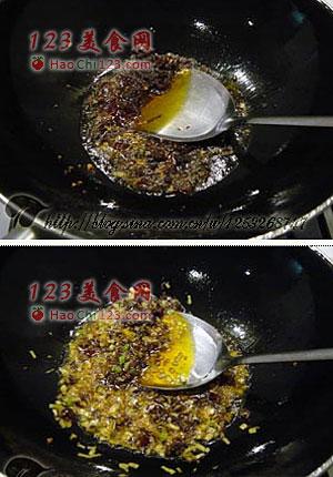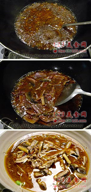 4、炒锅再下2大匙油,将油烧至6成热时放入剁碎的郫县豆瓣炒香(中火),加入姜末、葱末、蒜末炒香,加肉汤烧开(大火),下鳝鱼段搅散,待鳝鱼变色后加入盐、生抽、起锅盛入碗内,面上撒上剁碎的干辣椒和花椒。