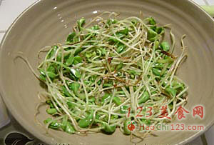 3、葱80克切丝20克切末,干辣椒用剪刀剪成段。炒锅下2大匙油,放干辣椒段和花椒炒成棕红色捞出(关火)剁碎待用。再开大火,将油烧至6成热时下葱丝炒香,下豆芽炒断生,盛出放入大碗底部。