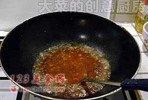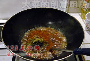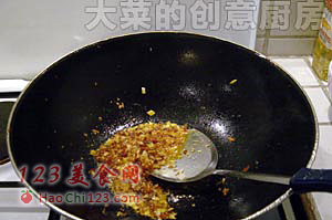 3、将锅中多余的油倒出,留3大匙油,放入泡红辣椒末、姜、葱、蒜末炒出香味,放入料酒。