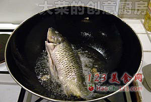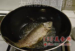 2、轻轻晃动锅,让油接触鱼的各个部分,用锅铲将鱼翻面,再炸1分钟左右,捞出,沥干油待用。