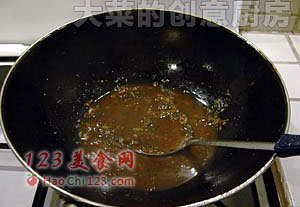 8、、锅内汤汁加醋、糖、少许盐调味,淀粉加少许水调成湿淀粉,倒入锅中的汤汁中,离火勾成薄芡。