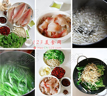 冷冻鲷鱼600克、干辣椒50克、小油菜、金针菇、姜、蒜各适量。2、将金针菇和小油菜分别焯熟,放入容器中。