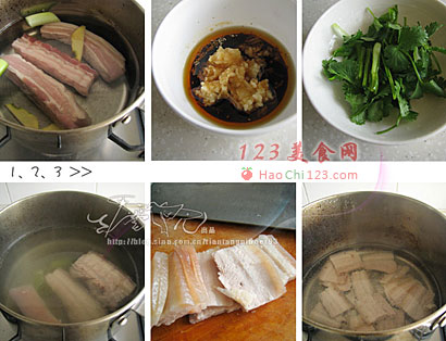 6、再将切好的五花肉片过几秒钟的开水捞出,码放在盘中,淋上味汁,撒上香菜即可。