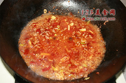 3、牛肉末炒干水气后,转小火下豆瓣炒,炒出红油,加汤烧。