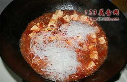 4、水开后将豆腐下锅,加盐、糖、鸡精、胡椒粉,大火烧10分钟后,将粉丝下锅。