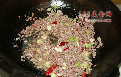 2、锅中烧油,炒香干辣椒、花椒,再炒香葱姜蒜,将牛肉末下锅炒熟。