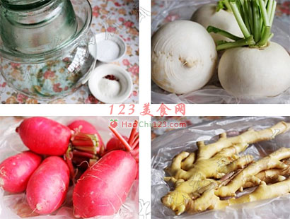 圆白萝卜、红皮萝卜、嫩生姜、蒜8瓣、细豇豆(专供泡菜用的)。2、白萝卜,因为专门用来做酸萝卜,一般选用圆的。去皮,皮留用。一个萝卜切成两块或者四块。