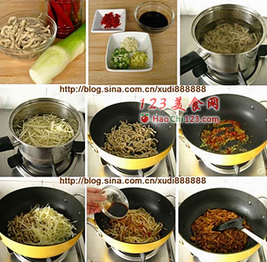 4、炒锅烧热下油烧热,下素肉丝煸炒2分钟盛出。